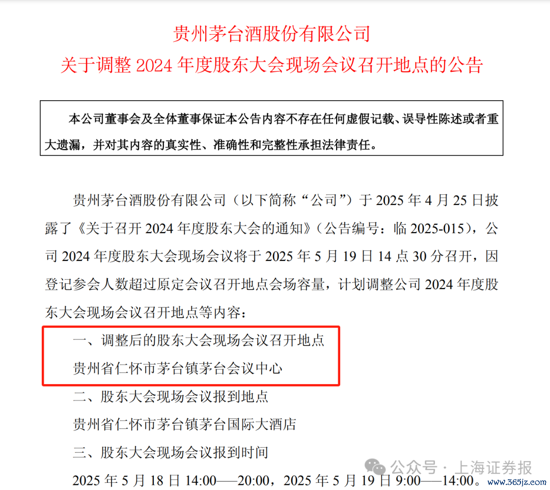 回溯此前公告,贵州茅台拟于5月19日14时30分召开2024年度股东大会,召开地点为茅台镇茅台国际大酒店。